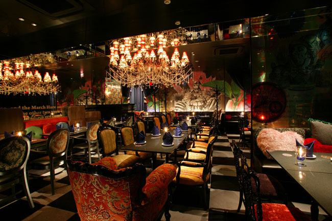 Walking through the crowded neon streets of Kabukicho with drunk groups ofsalarymen and hungry-eyed hosts looking for their night’s prey, we wouldn’t have expected to find an entirely different world beneath our feet. But as the elevator door opened on restaurant Ehon no Kuni no Alice, we were stunned to find ourselves teleported to a land of fantasy and fairytale.A tall, attractive, Alice-in-Wonderland-clad waitress appeared from a camouflaged door and led us through the hidden entrance of the restaurant. Cheerful Disney music played in the background as we were seated in a semi-private booth with a thin curtain and a glass wall protecting our privacy. The dimly lit interior had a distinct Alice-meets-gothic-Lolita vibe. The center of the room was decorated with an eye-catching gothic chandelier, and we noticed a dozen or so “Alices” and attractive hosto-like waiters dressed in formal attire. The restaurant was abuzz with excited customers taking pictures and squealing “Kawaii!!” at the waitresses. Inevitably, we joined them.