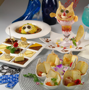 Next up was a small, cutely named appetizer, A Mad Hatter at the Tea Party (¥240 each)—bite-sized pieces of toast with mozzarella cheese and tomato, arranged to look like a book. Next came The Caterpillar’s Rice Rolls with Avocado & Tuna (¥950), a California roll shaped like a cute worm, and Fried Camembert on a Chessboard (¥550), which was cheese and biscuits served with strawberry jam. This unlikely sounding combination tasted surprisingly good. For our main dish, we went for the “Cheshire Cat-style” risotto with bacon and porcini (¥850) and The Hearts Pizza (¥850), which was a basic cheese variety that the waitress taught us to “execute” using a pizza cutter.