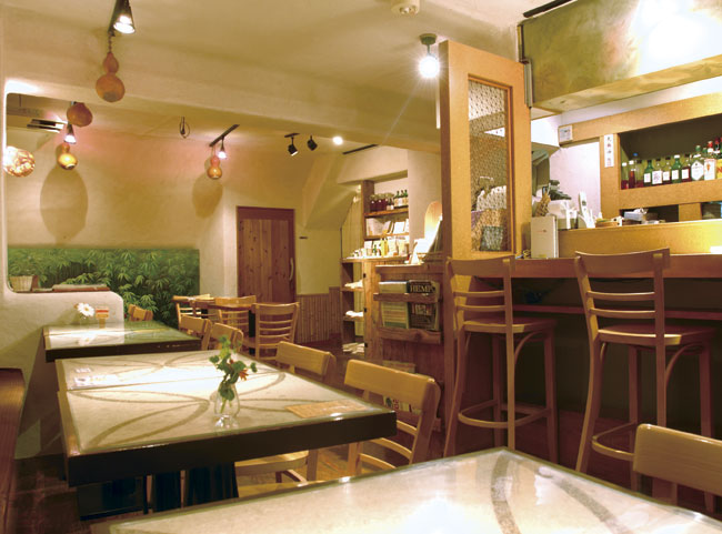 On entering the restaurant, we were asked whether we wanted to sit in the smoking or non-smoking section. This baffled us entirely, so, in the absence of a bong, we settled ourselves in a non-smoking seat. On this particular Tuesday night, fellow diners included just a young Japanese couple and a pair of OLs, with sadly not a cloud of smoke to be seen. The café-style interior was strangely light and airy, and the hemp leaf mural that adorned the walls was in oddly good taste. Indeed, this was the only obvious sign that we were in a “hemp restaurant.” On closer inspection, we discovered that hemp was used as a subtle design motif throughout, with the seeds even inlaid under the glass-topped tables.