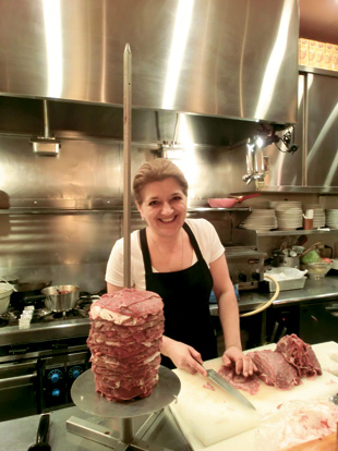 We were lucky enough to witness Elif methodically construct a giant spindle of meat for her doner kebabs. She chatted to us as she patiently trimmed wafer-thin slices of meat and piled hundreds, one by one, onto the giant metal skewer. She inserted the occasional layer of fat, which was probably the reason why the kebab we ordered was so divinely moist. Our dish was the iskender kebab—succulent shaved meat swamped with a piquant mixture of yogurt and wonderfully rich tomato sauce, and layered with chunks of toasted flat bread (¥2,100). Unforgettable. This is just one of the various grilled meat dishes on offer, but sadly we were physically unable to try more.