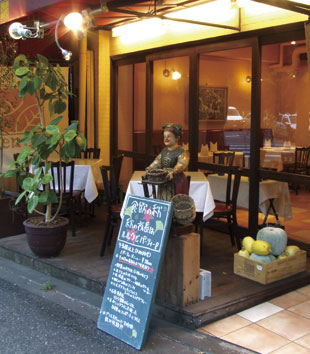 Located along Inokashira Dori west of Yoyogi Park, the restaurant can be easily spotted by its yellow sign, outdoor tables and ceramic statue of an old maid. A chalkboard announces the day’s specials.