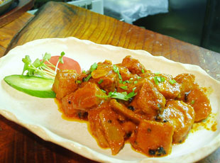 On our most recent dinner visit we passed over the latter two—with entries like chowela spicy pork (¥735) and tandoori-baked prawns (¥1,260)—and concentrated on the former. Our order for three consisted of aloo gobi (¥735), a dry curry with tomato, cauliflower and potatoes; creamy spinach and potato curry (¥787), with big, pillowy naan (¥315); our perennial favorites, deep-fried samosas (¥577 for two); and the best dish of the night, melted homemade cheese over fried cauliflower, green beans and tomatoes, called chasumasu (¥735).