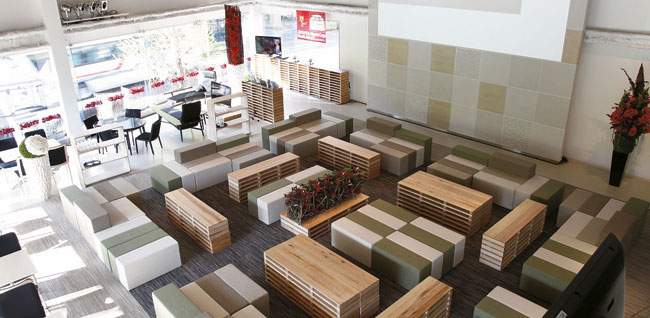 People who were here for the last couple of World Cups might remember Nakata.net Cafe, the temporary hangout that sprang up during the tournament in 2002 and 2006. After stints in Tokyo International Forum and Omotesando, it’s back—this time near Harajuku station in what looks like an unused car showroom. Tables ring the interior, with low-rise cushion sofas occupying the center ground, and matches are projected onto a screen that looks bigger than my apartment.