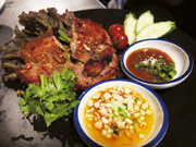 Lunch sets are a great deal, with one of four main dishes to choose from including rice, soup, Vietnam-style shrimp rolls, salad and a drink (¥1,100). À la carte is more risky. Of assorted dishes we tried, they weren’t all up to scratch. The Thai grilled chicken (¥900; pictured) however, was a winner—thick juicy strips of marinated chicken with sweet chili and cashew dip and plenty of fresh coriander. The pad Thai was less convincing, with the dodgy inclusion of star anise throwing us off somewhat. However the Tom Yum with egg noodles (¥900) was a staple done well, murky with flavor, a healthy dose of lemongrass and a powerful kick.