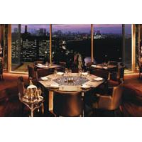 The red-carpet treatment starts in the lobby, where dedicated elevators whisk diners up to one of Tokyo’s most stunning rooms. A sloping walkway runs from the lifts past a bar area that has floor-to-ceiling windows and glittering chrome “trees”. Enveloped on three sides by glass, the spacious main dining area features semi-circular banquettes, date-friendly bench seats, and a wall-length video screen. The entire space, tinted in rich purple hues, is prowled by hip young waitstaff.