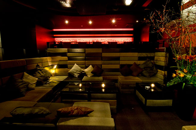 The bar’s dimly lit interior gives center stage to a sunken pit with padded walls (for safety?) and stacks of slate-colored cushions and pillows, arranged into four seating areas. There are two bar counters, each of which peddle their own form of MiamiVice-style chic, faux marble and all.