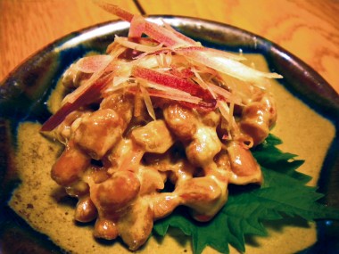 Heading inland to Nagano, we surveyed natto mixed with umeboshiand Japanese mild ginger, or myoga(¥620). Served on a single perilla leaf, it looked like a lonely lump, but the tart and salty plums with the soft ginger flavor of myoga dressed the big, firm beans up beautifully.
