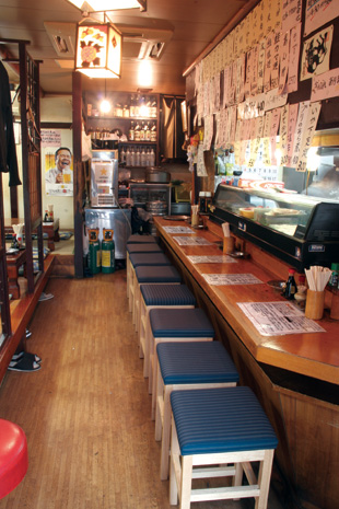 We entered Dai-Chan to the usual cry of “Irashaimase” and were promptly squeezed in at the counter. The dining area might be small, but it still manages to fit in 37 people, whether on the tatami mats or stools. In a country that harbors an obsession for the new and the clean, Dai-Chan’s smoke stains, old posters and general worn look add nicely to the authenticity.