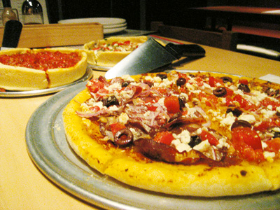 The deep-dish pizza comes in two sizes, with the smaller one just the right size for one hungry person, though they are happy to pack up any leftovers for you. We were warned that the pizzas could take as long as an hour, but they were ready significantly sooner than that. The crust, the product of months of home experimentation, is a little doughier than I normally like, but it is certainly up to the challenge of holding a good couple centimeters of toppings. They also offer regular pizzas, but only in large.