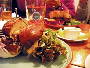 The burgers arrived cut in half, the long metal sandwich pins a necessity for these little beasts. The pink-centered lamb patty sat atop generous slices of tomato, avocado, and crisp lettuce on springy focaccia bread. The regular burger arrived in a similar outfit, but on a toasted bun instead, pleasing the tastebuds.