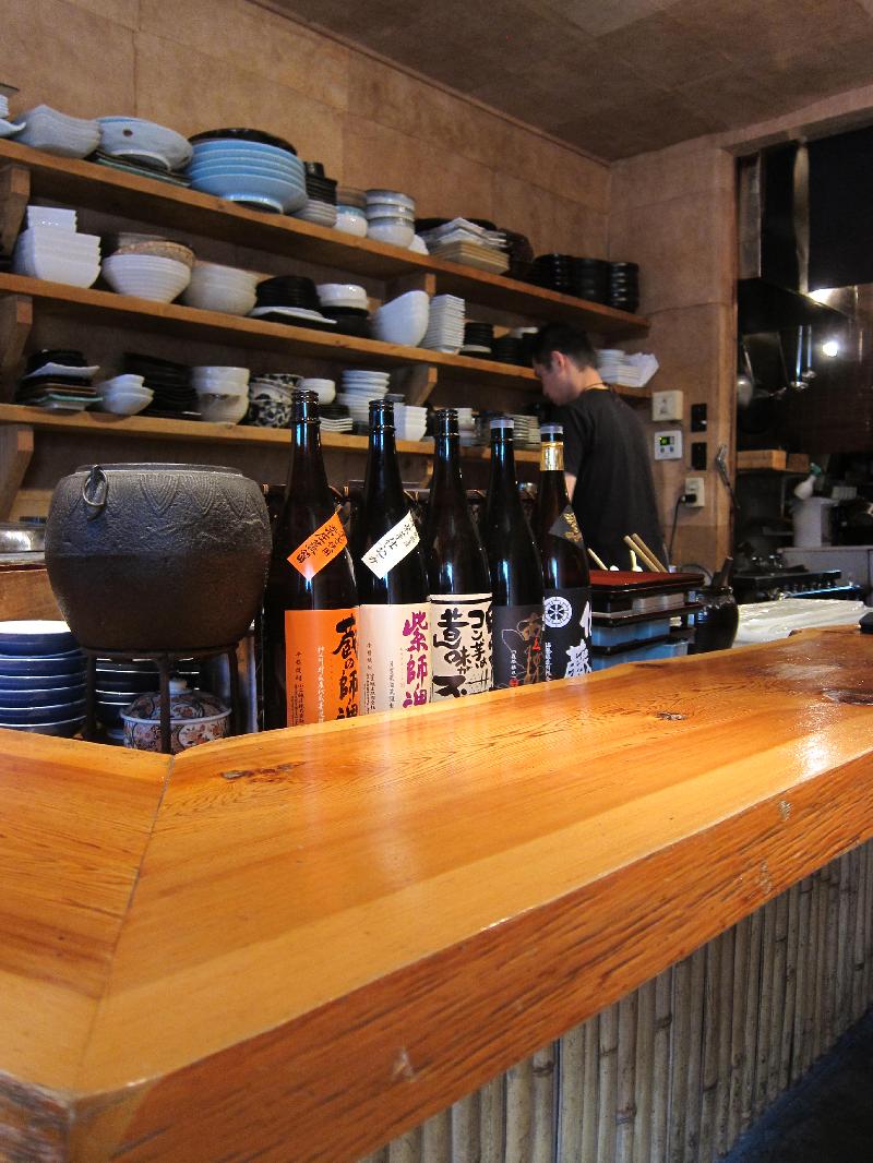 Hibachi-grilled meat and vegetables are one of the Enraku group’s specialties. We plump for a platter of mixed vegetables (¥850) and one of the day’s specials, a side of duck breast marinated in red wine (¥600) to round out the order. A little charcoal grill placed in front of us, large discs of yama imo (mountain yam) sizzle as they hit the barbeque. Drizzled in olive oil and grilled until caramelized, they call out for liquid refreshment.