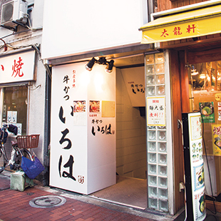 Note: The sign is in Japanese; look for “牛かつ いろは” in black, calligraphic text on plain white. Each visitor must buy one food item.