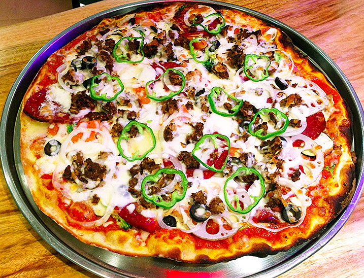 International oasis of original gourmet pizzas and burgers, plus vegetarian and other dishes—all made with love by people who love people and food.