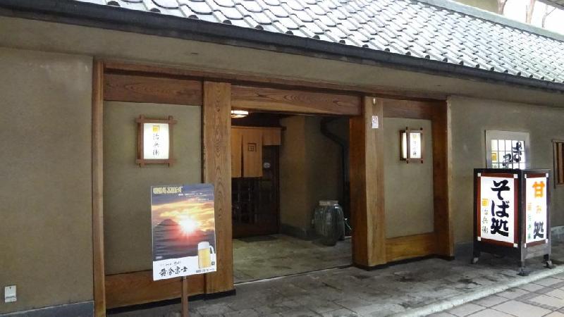 Jihei(治兵衛) is a casual soba shop along the main shopping street of Hakone-yumoto. It is easy to drop in and enjoy soba there while you are waiting to catch a bus or train. The restaurant is only a minute from the station—just past the second side street coming from the red bridge on the busy shopping arcade. It has a brown wall and a traditional black-tiled roof.