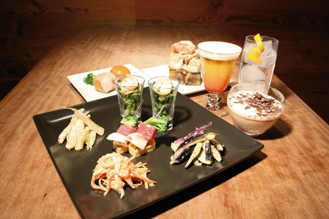 While sake replaces vodka or gin in many of the menu’s cocktails, Sake Hall is staking its credentials on two original creations, the “Sake nic” (¥580) and the “Sake espuma” (from ¥630). On a recent visit after work, the former was a welcome start to the evening’s proceedings; a dry and refreshing spritzer-like beverage intended to quench one’s thirst on a scorching day. The sake is mixed with a half tonic, half soda water blend, a sliver of orange peel lending color and fragrance.