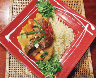 On our visit, we started with palmito salad with prawn and avocado (¥950). Creatively presented in a candy jar-style container, the salad offered us our first experience of this vegetable, harvested from the palm of a coconut tree. We then ordered some koftas (¥650 for two), spicy minced mutton kebabs served with yogurt, cabbage and a selection of salts for dipping. We also tried the clam and squid couscous with a sauce made from squid ink (¥1,450). Served on the side, the sauce allows customers to choose the richness of their dish. Portions were reasonable, but we had hoped the kebabs were larger, as the plate quickly disappeared. Most diners choose a wide selection of kebabs, and can easily do so with prices ranging from ¥650-¥950.