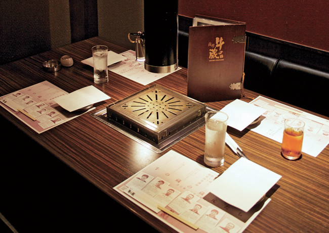 Ushinokura peddles some of the finest flesh in the city. This restaurant is justly proud of its perfectly marbled yakiniku beef, exclusively Black Wagyu from the Satsuma region of Kagoshima. So proud, in fact, that photos and bio sketches of the purveyors—seven folks, young and old, with bright eyes and friendly smiles—are prominently displayed in the foyer, on the PR materials, and even on the placemats of each table.